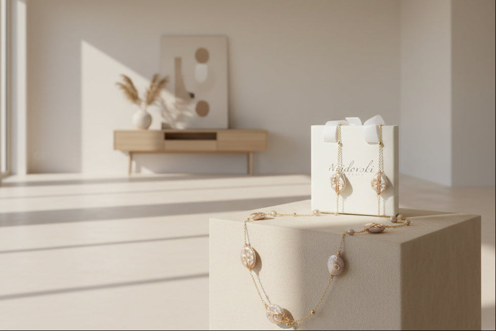 Le collier est présenté avec soin dans un emballage élégant, prêt à être offert.