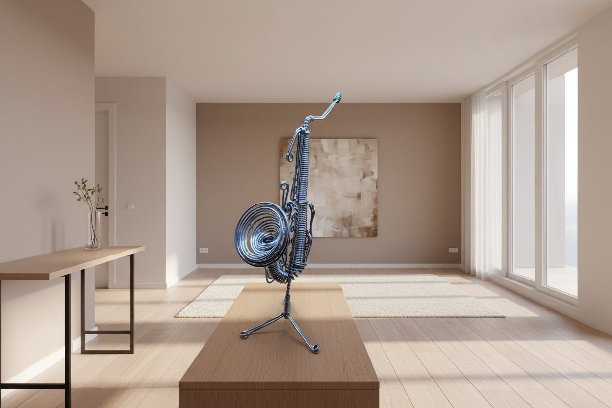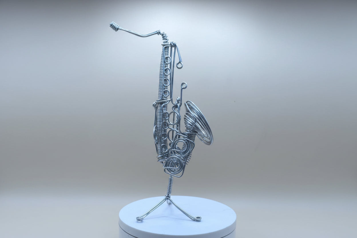 Sculpture artistique représentant un saxophone, entièrement façonnée à la main en fil métallique. Chaque courbe est travaillée avec précision pour capturer l’élégance, le mouvement et l’énergie de cet instrument emblématique du jazz.